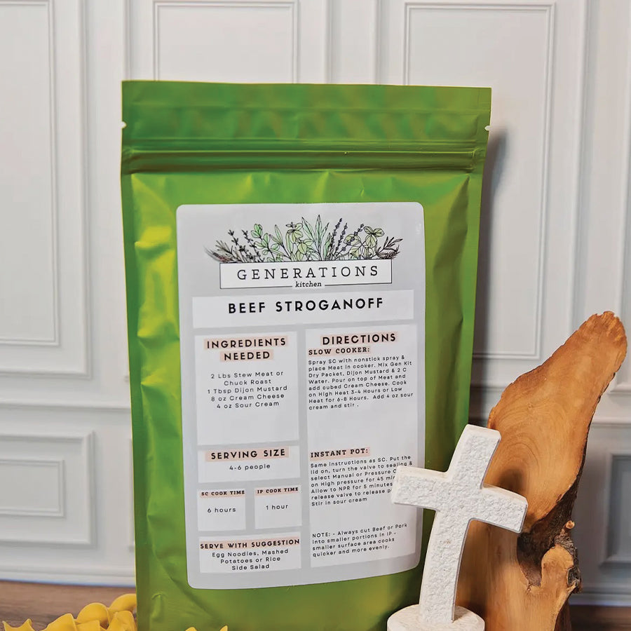 Roast, Stew Meat or Ground Beef + Generations Kitchen Beef Stroganoff Starter = easy delicious dinner! Slow-cooked, tender beef with mushrooms in a mouthwatering gravy, just waiting to be poured over egg noodles or mashed potatoes.