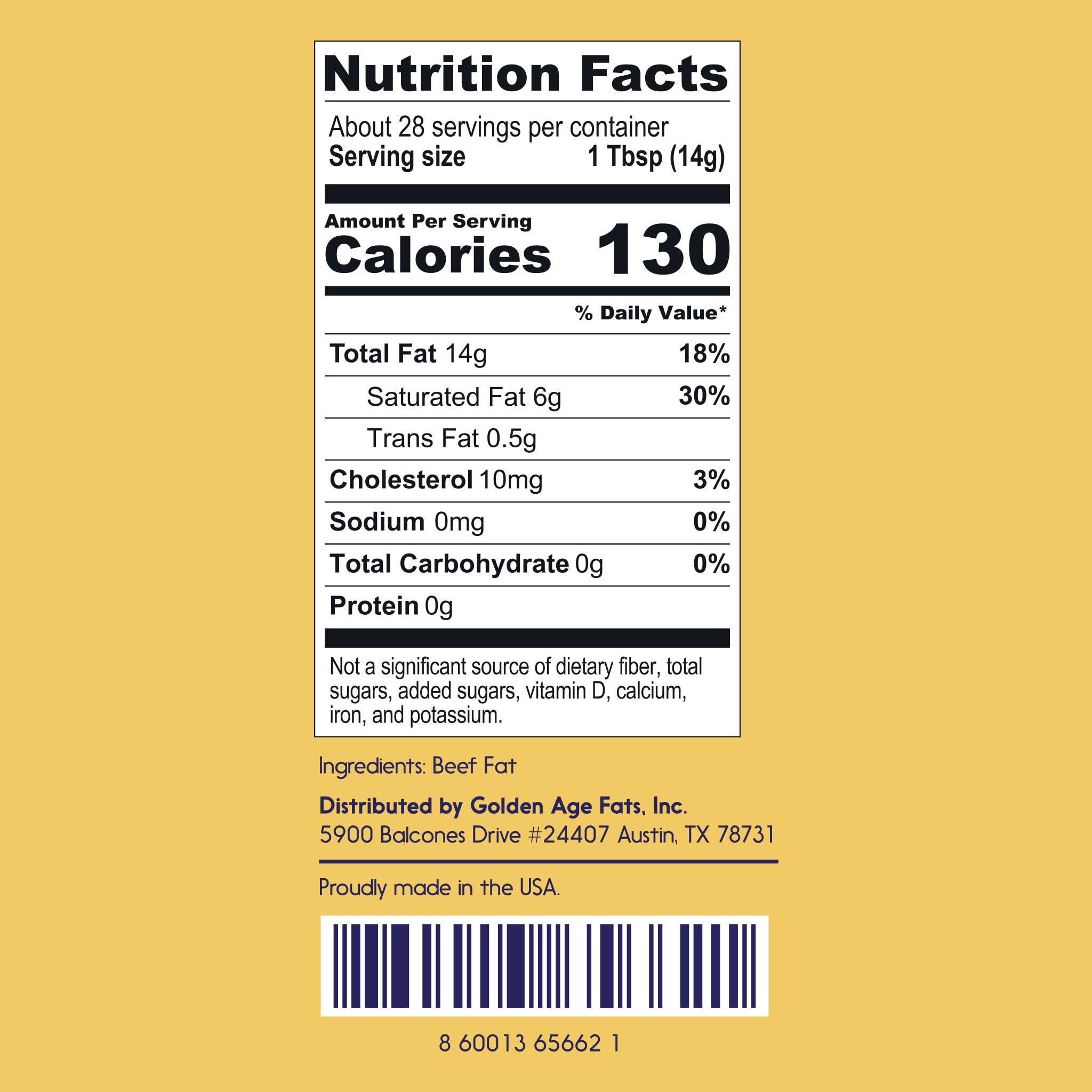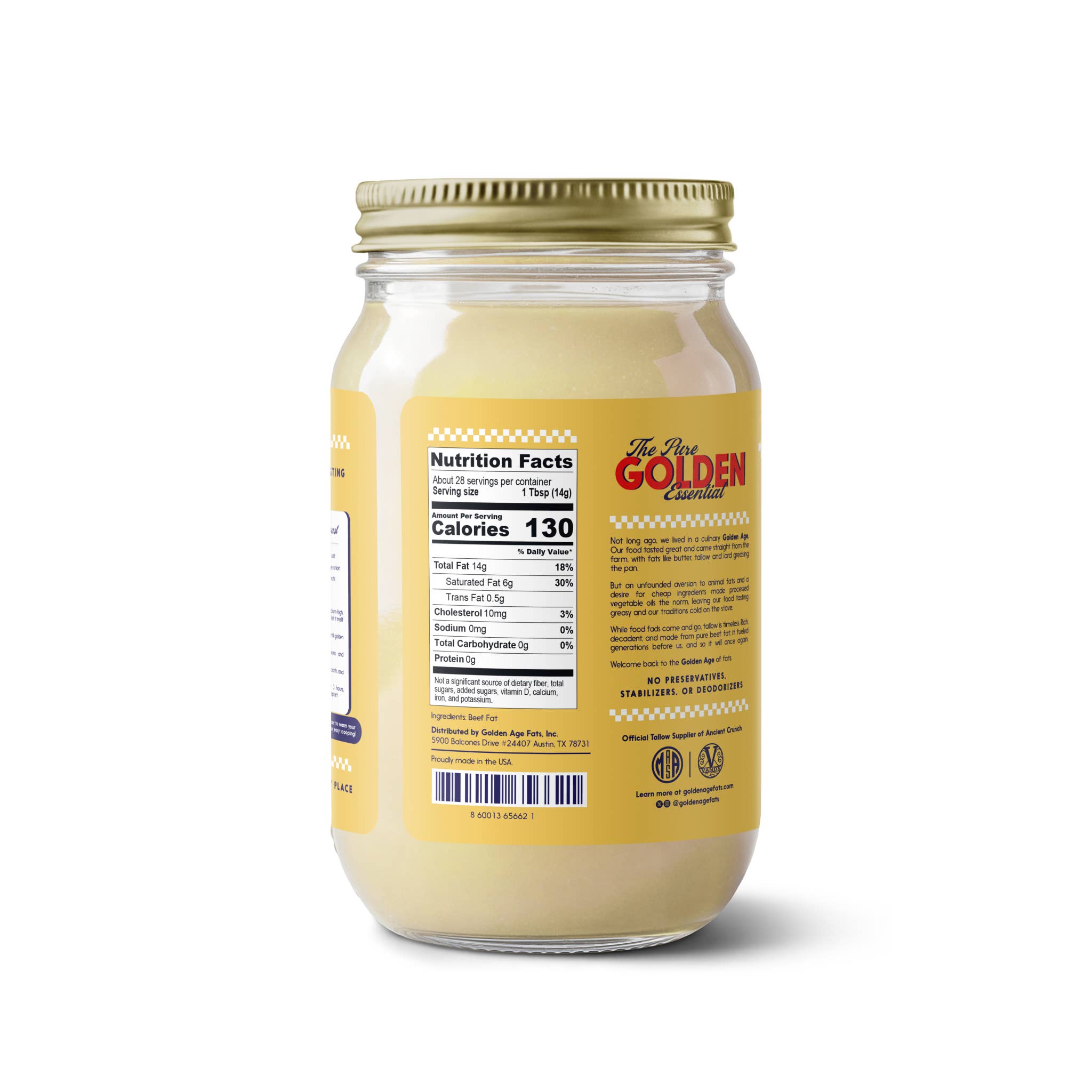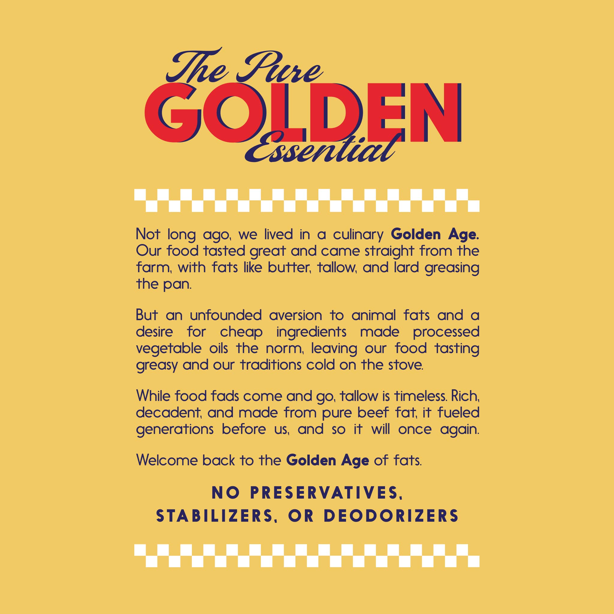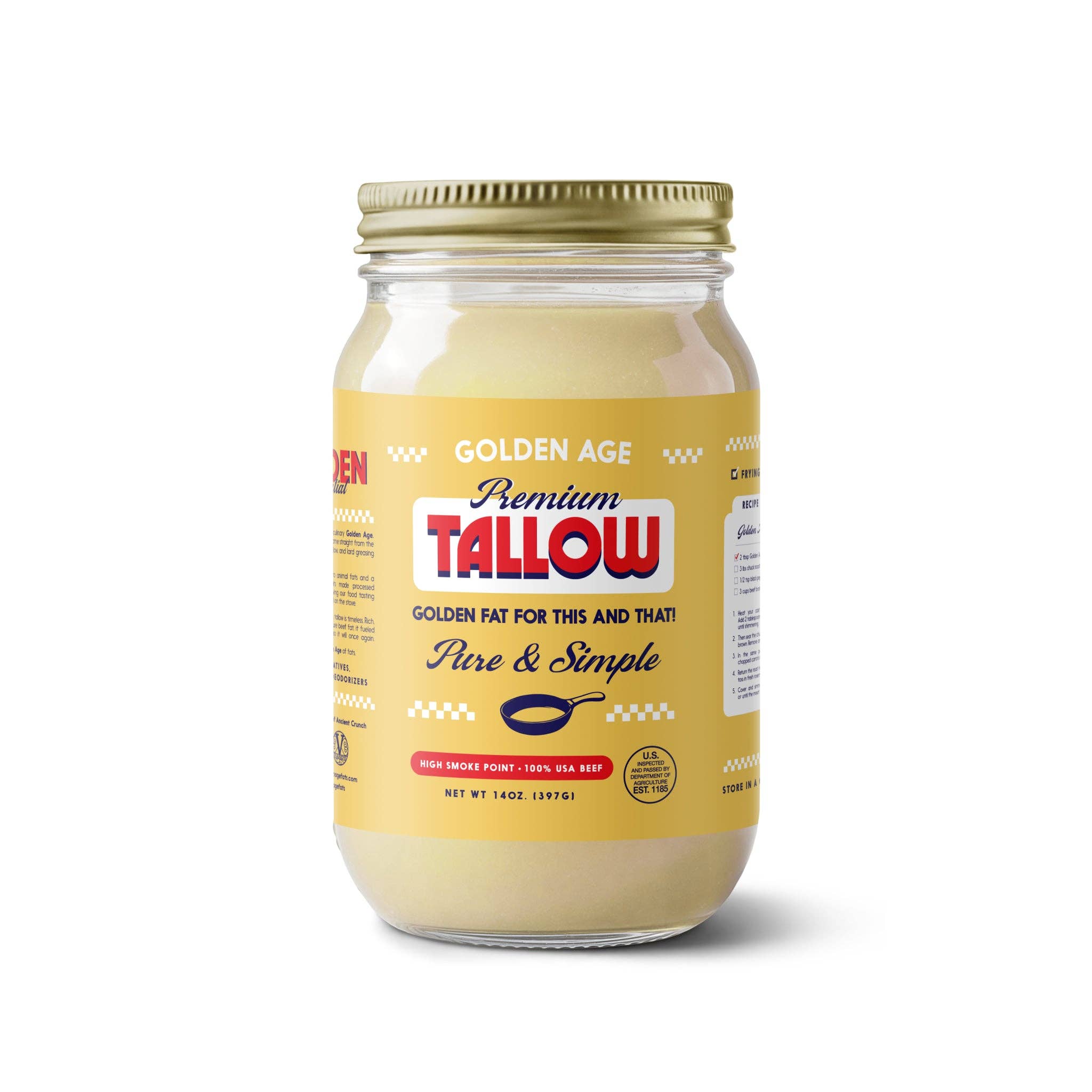 Golden Age Fats brings you a culinary delight from the past with Pure & Simple Beef Tallow. Rich and decadent, our tallow is a testament to the timeless tradition of cooking with pure beef fat. This tallow is ideal for enhancing the flavors of a variety of dishes. It's a delicious alternative to processed oils, bringing a taste of the farm straight to your kitchen. Welcome back to the Golden Age of fats with our Pure & Simple Beef Tallow.